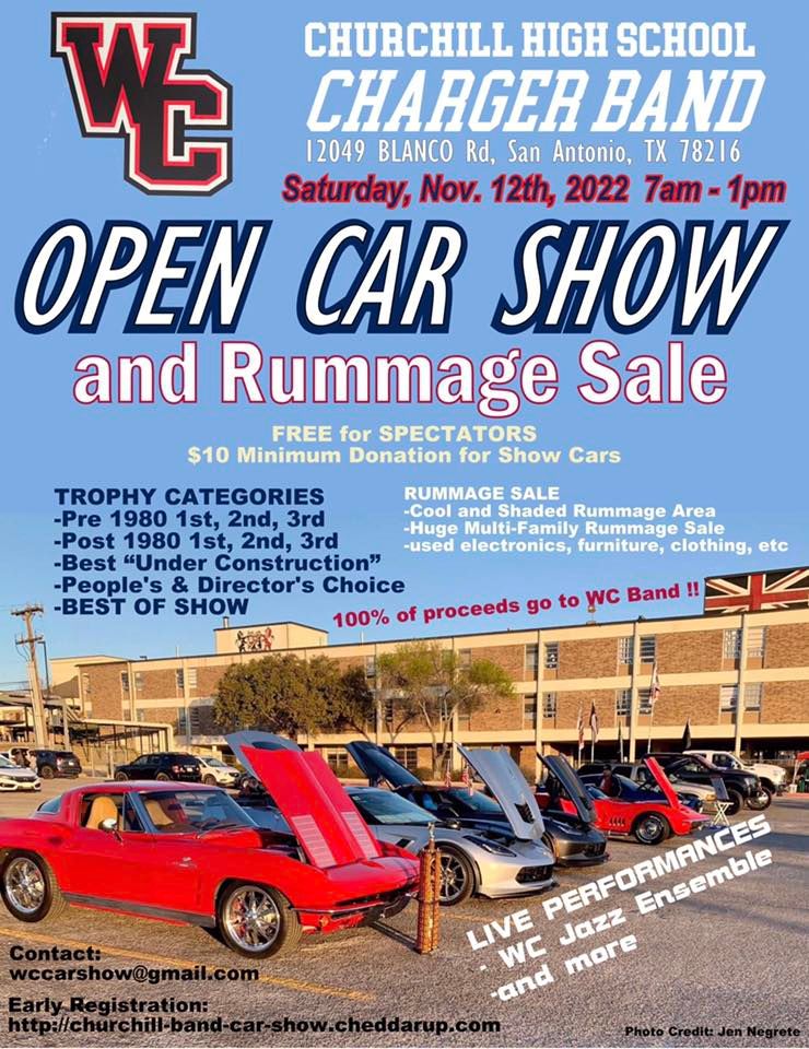 LOCATED AT ANCIRA CHRYSLER DODGE JEEP RAM 10807 1-10 W SAN ANTONIO TX FREE TO SPECTATORS REGISTRATION DAY OF SHOW 9 TO 11 AM. November 4th November 4th. WC Charger Band Open Car Show.